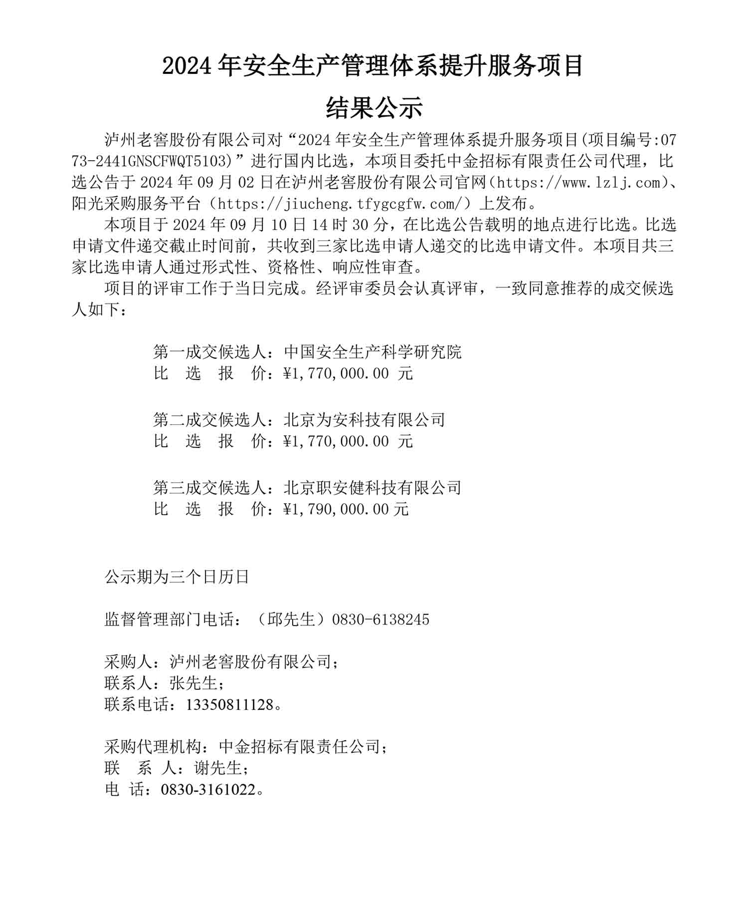 2024年安全生产管理体系提升服务项目结果公示