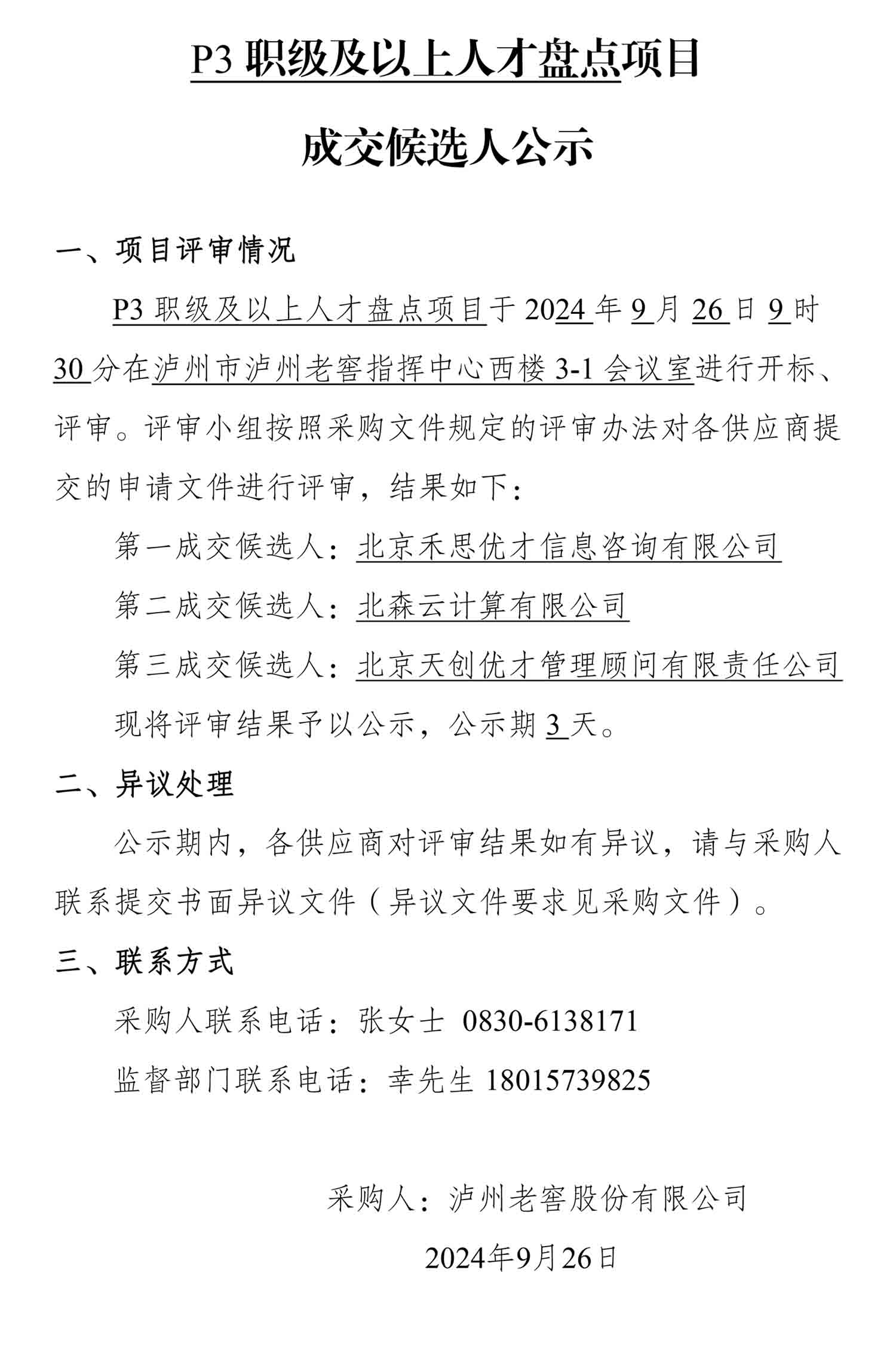 P3职级及以上人才盘点项目成交候选人公示