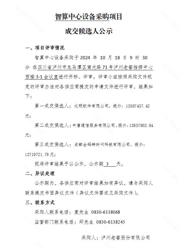 智算中心设备采购项目成交候选人公示