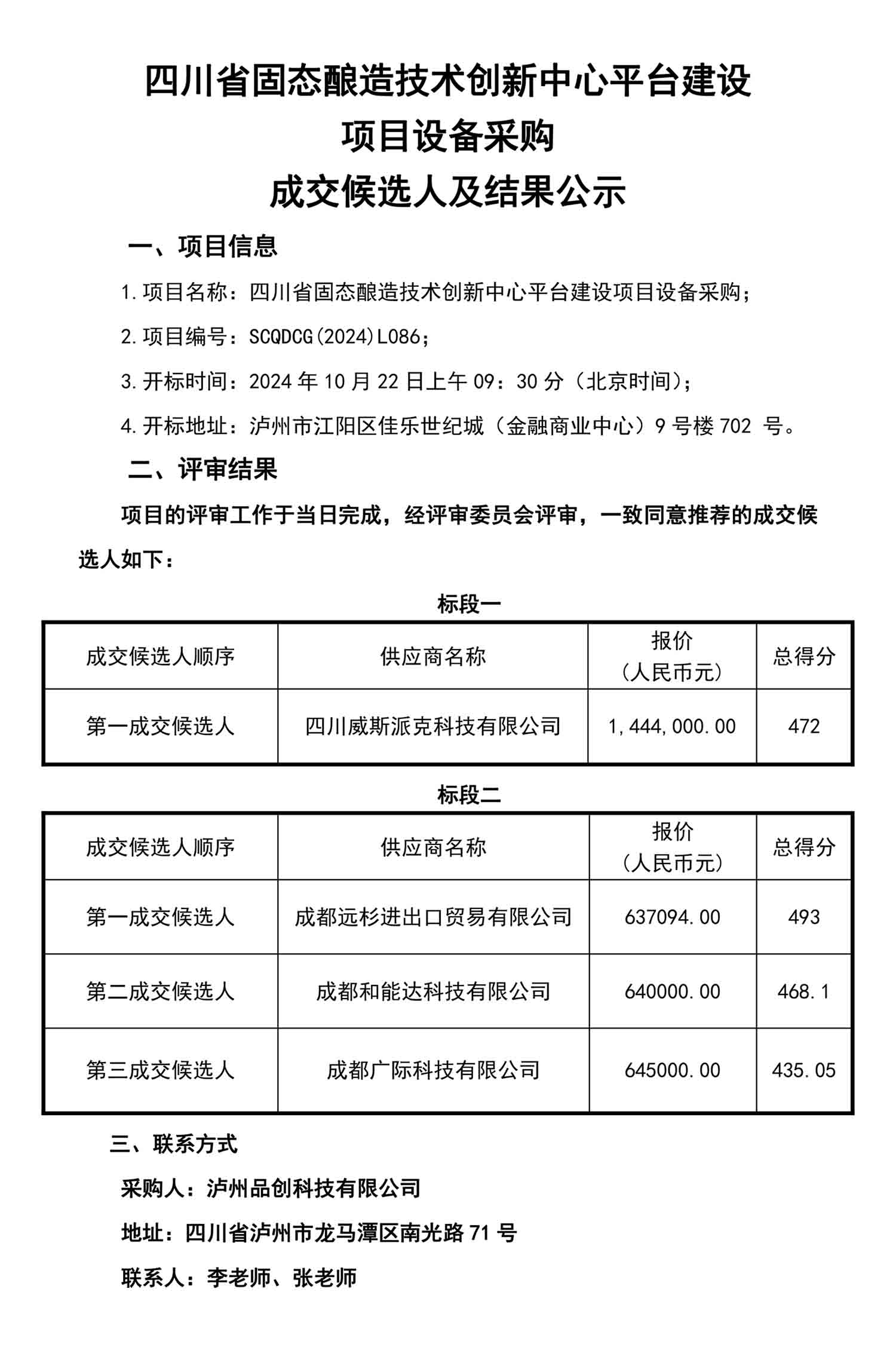 四川省固态酿造技术创新中心平台建设项目设备采购成交候选人及结果公示