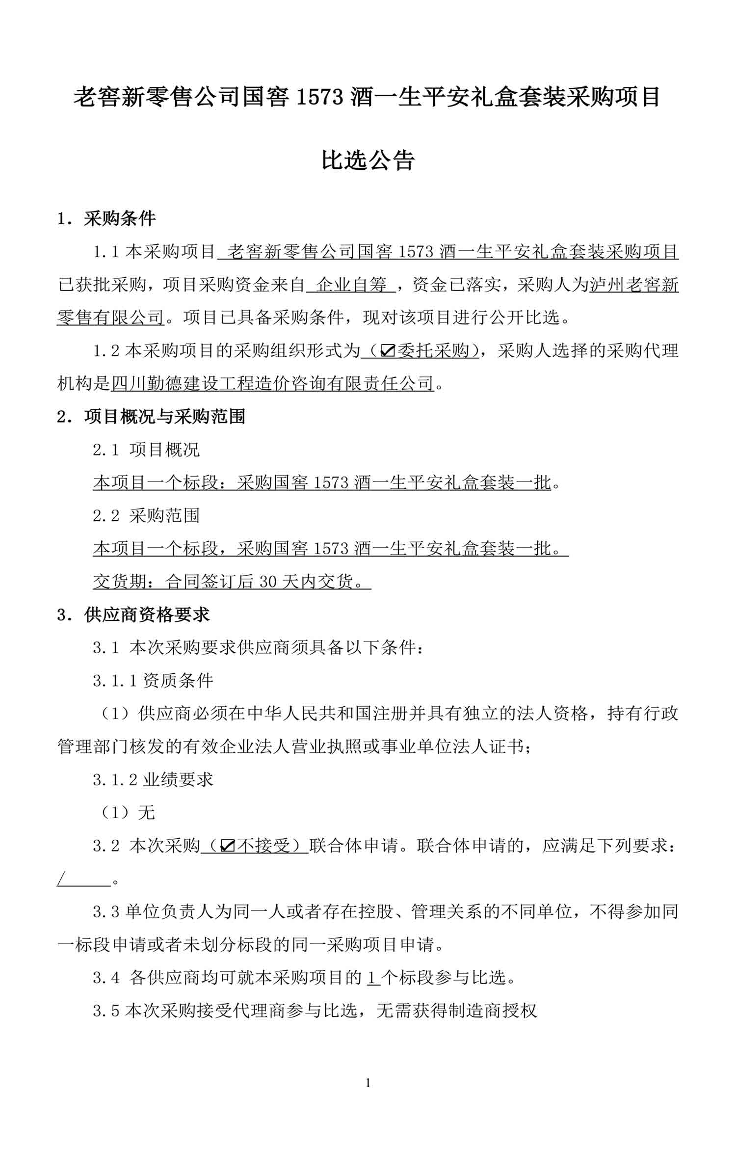 公海gh555000aa线路检测新零售公司国窖1573酒一生平安礼盒套装采购项目比选公告