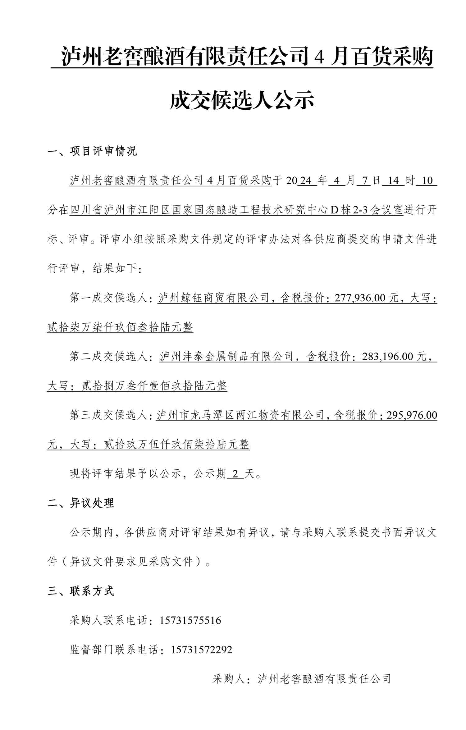 公海gh555000aa线路检测酿酒有限责任公司4月百货采购成交候选人公示