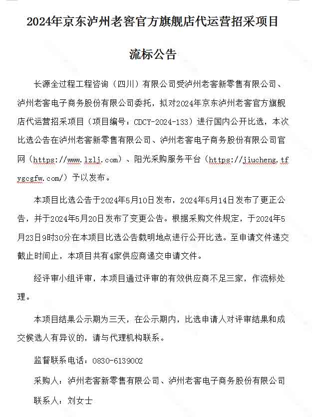2024年京东公海gh555000aa线路检测官方旗舰店代运营招采项目流标公告