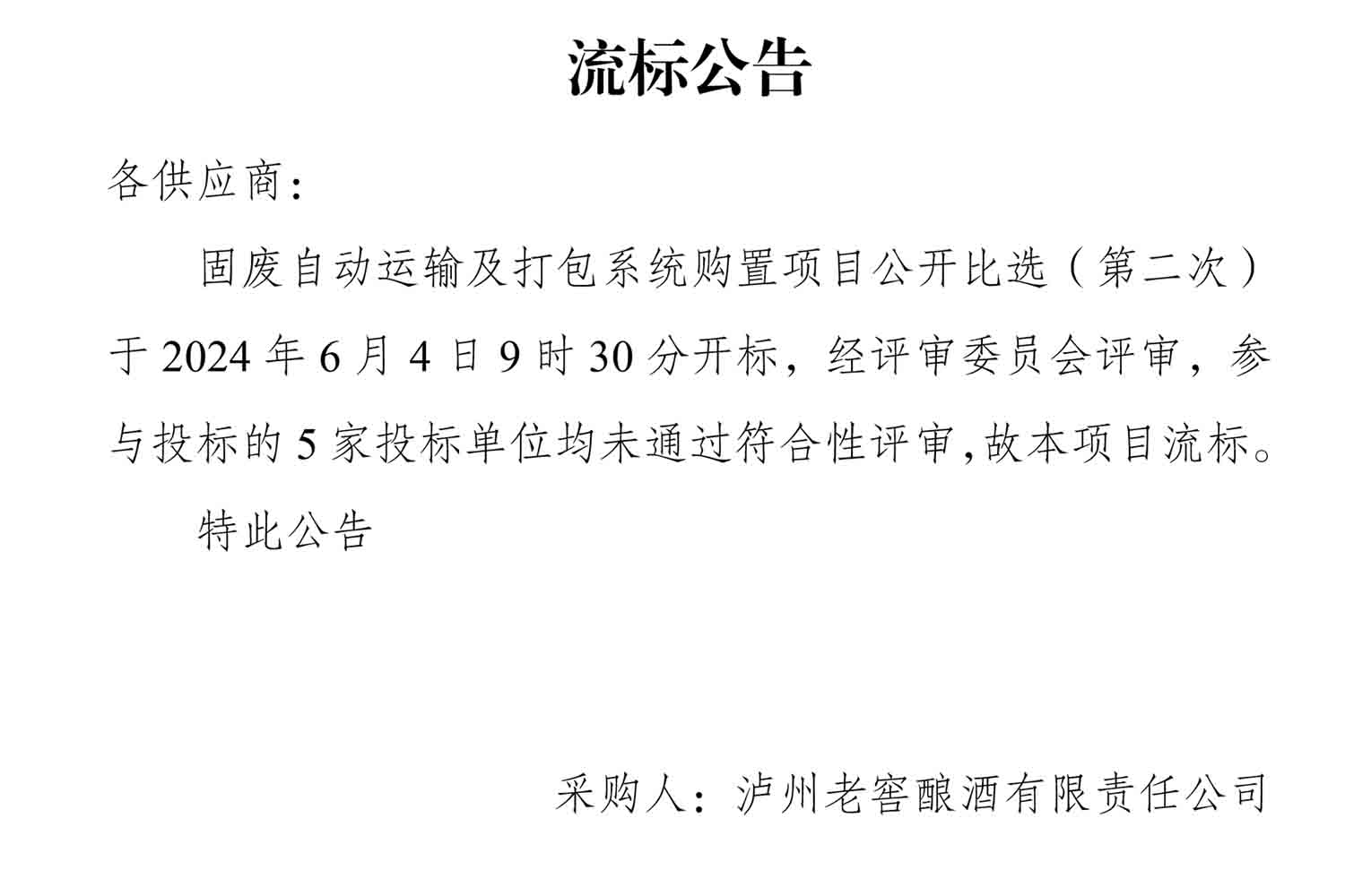固废自动运输及打包系统购置项目公开比选(第二次)流标公告