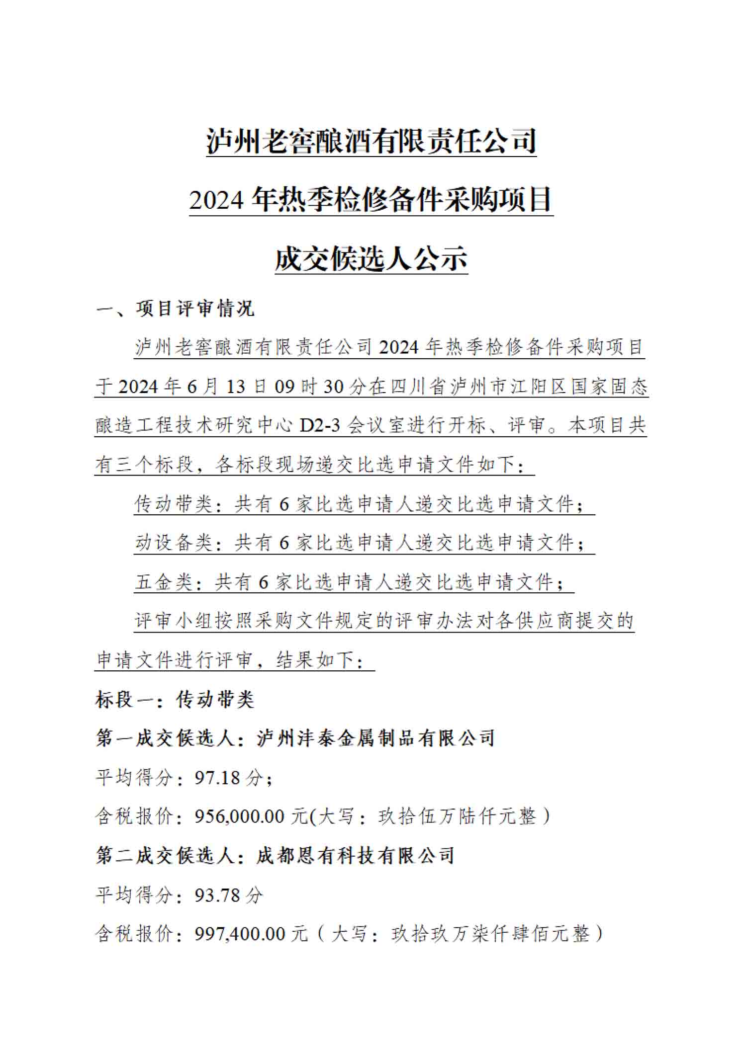 公海gh555000aa线路检测酿酒有限责任公司2024年热季检修备件采购项目成交候选人公示