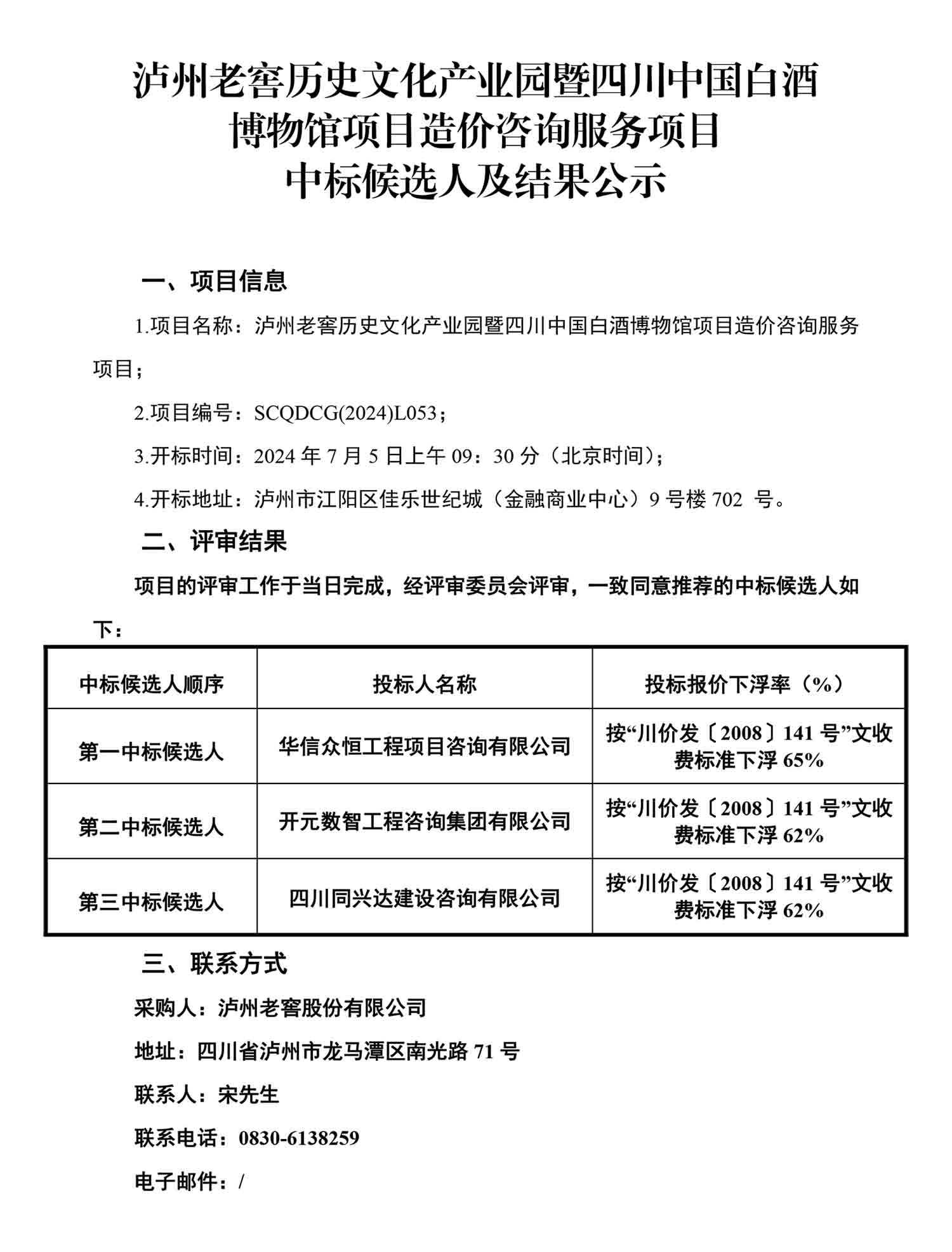 公海gh555000aa线路检测历史文化产业园暨四川中国白酒博物馆项目造价咨询服务项目中标候选人及结果公示